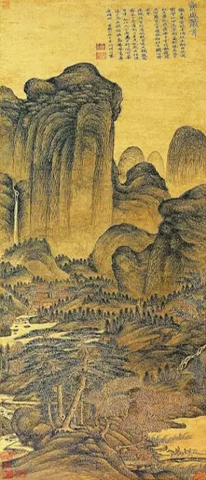 王蒙此作繁线密点,苍苍莽莽。“繁线”主要体现在其在董源披麻皴基础上创变出的牛毛皴上,以卷曲如牛毛的皴笔,表现山石的机理结构。“密点”则主要表现在其对巨然焦墨大点点苔方法的取鉴上,秃笔、重墨,或聚或散,以干、湿、浓、淡、光、毛不同质感的苔点丛生错落。元代绘画流传至今凤毛麟角,这幅佳作在中国绘画史上具有相当重要的历史意义。