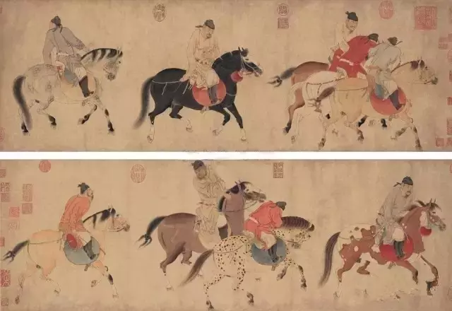 《五王醉归图卷》用的是宋代纸本,高35.5厘米,长212.5厘米,曾是清宫旧藏。该画刻画了唐玄宗五兄弟的故事,画中五王,指临淄王李隆基(即后来的唐玄宗)、宋王李成器、申王李成礼、岐王李范、薛王李业。唐玄宗年少时与四位兄弟感情和睦,经常相从宴饮,斗鸡击球,外出打猎。这张画描绘了兄弟五人一起骑马游玩的场景。