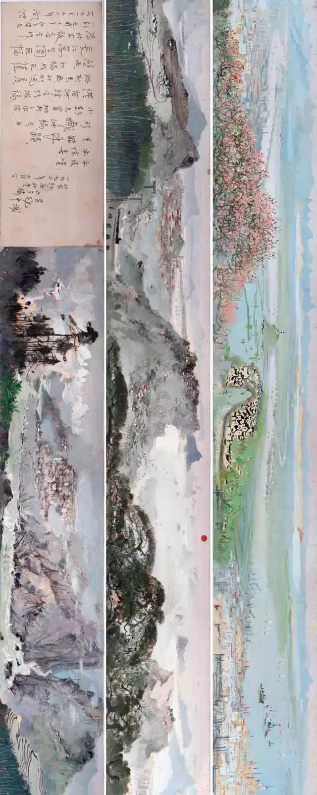 吴冠中《长江万里图》打破了油画二维平面的创造范畴,以中国传统的手卷形式展开内容,将时间和空间融合于一,作品的叙事性和画面的形式美感得到完美结合,不仅表现了吴冠中高超的西画功底,同时也将西画技法与传统的“江山卧游”概念相结合,彰显了吴冠中这一时期对油画艺术和水墨艺术卓有成效的探索。