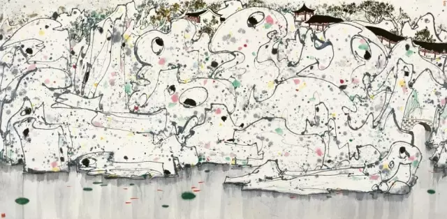 该幅作品是吴冠中点线色彩系列中留存在民间的尺幅最大作品,甚为难得。画中假山均以线条勾出,直线、折线、曲线及弧线等等的组合,雅致大方,变幻莫测。假山形状各异,有的玲珑剔透,有的气势磅礴,有平易近人之情,有光怪陆离之状,千奇百怪,妙在似与不似之间。