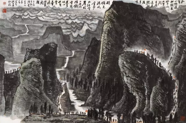 此幅作品作于1959年,是为了纪念建立新中国十周年以毛主席诗词进行的大型创作初稿。画中,景物横向展现,重山叠积,参差错落,雄奇壮丽。红军队伍沿狭窄山路从左往右横越画面。画家成功地将毛泽东诗词中的革命豪情与浪漫色彩视觉化。全幅结构规整,笔墨精严,气象万千。