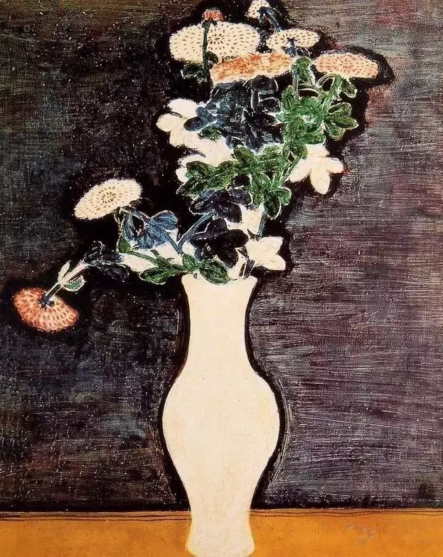 《瓶菊》纤维板油彩,51×40cm,1940年作。 常玉一生都极为坎坷,他的静物作品是他内心世界的一面镜子,画中的花朵大都孤单无力,残花败韵、强撑姿色,像失去母亲的孩子般孤单寥寂,无依无靠,直叫人有“残月伴秋寒,冷冷清清”的凄凉感。