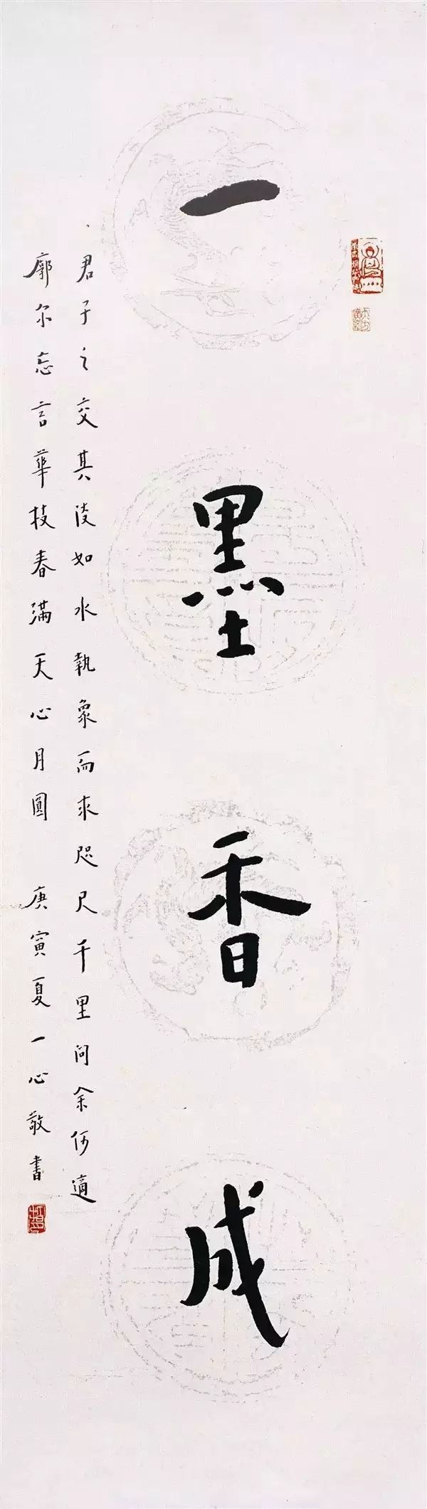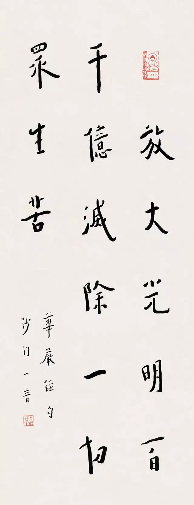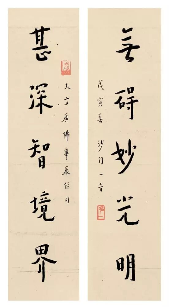 弘一大师的书法常以对联形式出现,内容取自佛教经典。字与字之间隔得较远,大概有三分之二个字的距离,给人疏落空阔之感,一个字是一个字,文质彬彬,很好地体现出“计白当黑”的美感效应。