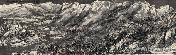 该画创作于2016年。在此幅长卷中,崔如琢以指墨为引,展现了一卷静默有力的初冬自然山水景象。从远处着墨厚重的大片山域出发,嶙峋的树木错落生长在山坡之上。近处的房屋半隐于山坡之间,大片水域以浅灰色的墨层缓缓展现在观者眼前。三人泛舟河上,与山间点缀的红叶及白雪保持平衡,传达出和谐的意境。